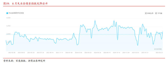 我们认为,就业形势变化或是及时推出增量储备政策的关键。从最新的失业金搜索指数来看,6月失业金搜索指数先降后升,就业群体的实际体感应保持关注。我们再次提示,从近五年数据回溯来看,当失业金领取条件及标准搜索指数持续高于近五年均值时,往往是社会对失业压力体感较大的时期,例如2020年的二至四季度、2024年的二至四季度。我们认为,当社会对失业压力体感较大的持续时间较长时,触发政策全力稳经济的概率或将上升。