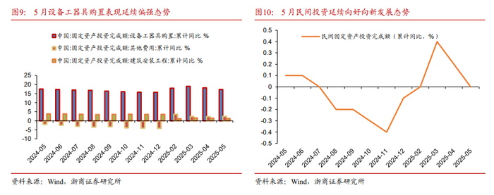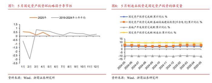我们预计,2025年1-6月制造业投资增速有望实现8.2%左右。我们判断,制造业投资的增速放缓或主要来自资本品价格下行因素扰动,制造业整体资本开支仍具有一定韧性。重要的是,制造业主要的预期差可能是关税调整后市场主体或对中长期不确定性产生担忧。我们判断,未来在出口波动的影响下,供给端大概率在抢出口效应下保持偏强态势,但固定资产投资尤其是制造业投资方面可能受制于中长期不确定性的约束,预计固定资产投资后续可能放缓。