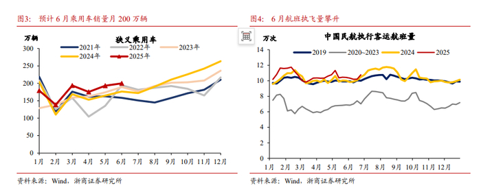 预计6月社会消费品零售总额同比+4.8%(前值+6.4%)。其一,“618”促销活动延续高强度运行态势,尽管前期消费透支和以旧换新政策补贴退坡使6月消费动能边际减弱,但整体销售表现依然亮眼,对实物商品零售形成显著拉动,是商品消费的核心支撑。其二,6月乘用车销量在政策刺激、厂商促销及消费需求释放的多重因素推动下,继续保持稳健增长态势,但价格促销或对汽车零售额形成拖累。其三,在端午假期的带动下,6月居民出行景气度较高,旅游与餐饮受益于行业出清和假日效应呈现较高景气度。其四,房地产市场疲软延续,对地产后周期相关消费形成负向拖累。