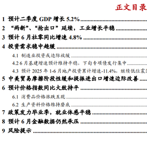 我们认为,6月经济维持弱修复态势,6月制造业采购经理指数(PMI)为49.7%,较5月上升0.2个百分点,但后续经济基本面的不确定性或有所增加,特别是外贸修复的斜率与可持续性。综合来看,二季度经济相较一季度将有所回落,经济运行在内外部环境不确定性抬升的过程中或呈现非线性波动的特征,供给和需求可能呈现K型分化走势。考虑前期逆周期政策将渐次落地形成对基本面的托底作用,预计二季度GDP实际增长有望实现5.2%左右。