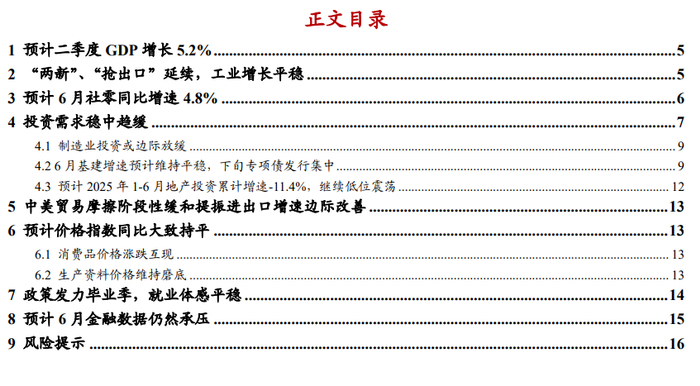 6月工业生产景气总体平稳,我们预计6月规模以上工业增加值同比增速或为5.6%,二季度规模以上工业增加值同比增速或为5.8%。一方面,“两新”政策持续发力,从内需侧带动相关行业生产向好,同时,工业稳增长着力于装备制造业积极态势;另一方面,在中美关税豁免期,抢出口(转口)对工业生产有较强支撑。
