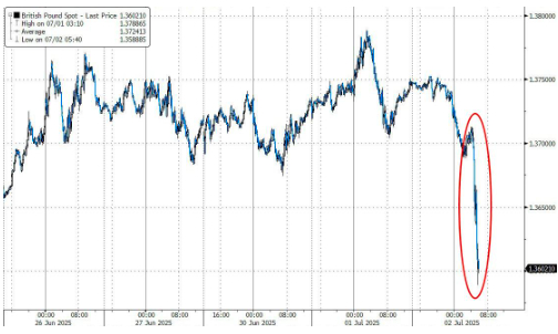 同时,英国股市在欧股当天普涨的背景下逆势下跌:英国富时100指数下跌约0.1%,英国富时250指数下跌1.3%;英镑也遭遇卖压,英镑兑美元盘中一度下跌超过1%,最低下探至1.3565,全天累计跌幅达到了约80点,成为了当天全球表现最差的主要货币。