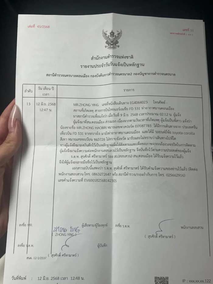 我弟弟一直从从事的模特工作已经四五年的时间,这次因接到杂志封面拍摄邀请,在2025年6月8日晚上12点33分在广州白云机场乘坐飞机FD531到泰国廊曼机场,2025年6月9日凌晨2点12到达泰国廊曼机场,凌晨3点15分在泰国廊曼机场6号门坐上了一辆车牌号: ขฉ3726 อุดรธานี的Toyota私家车被带到泰国达府后失联.原本预订的酒店(B Your Home Hotel Donmueang Airport Bangkok)也并未入住。