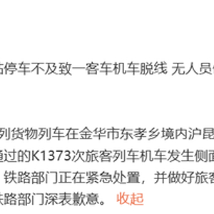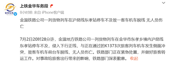 随后,@上铁金华车务段 发布情况通报并道歉:7月2日20时28分许,金温地方铁路公司一列货物列车在金华市东孝乡境内沪昆线东孝站停车不及,侵入下行正线,与正在通过的K1373次旅客列车机车发生侧面冲突,致客车机车前台车脱线,无人员伤亡。