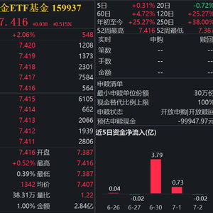7月3日(周四),黄金ETF基金(159937)上涨0.52%,盘中换手率1%,成交金额2.84亿元。拉长时间看,截至2025年7月2日,黄金ETF基金(159937)近3月累计上涨4.98%。