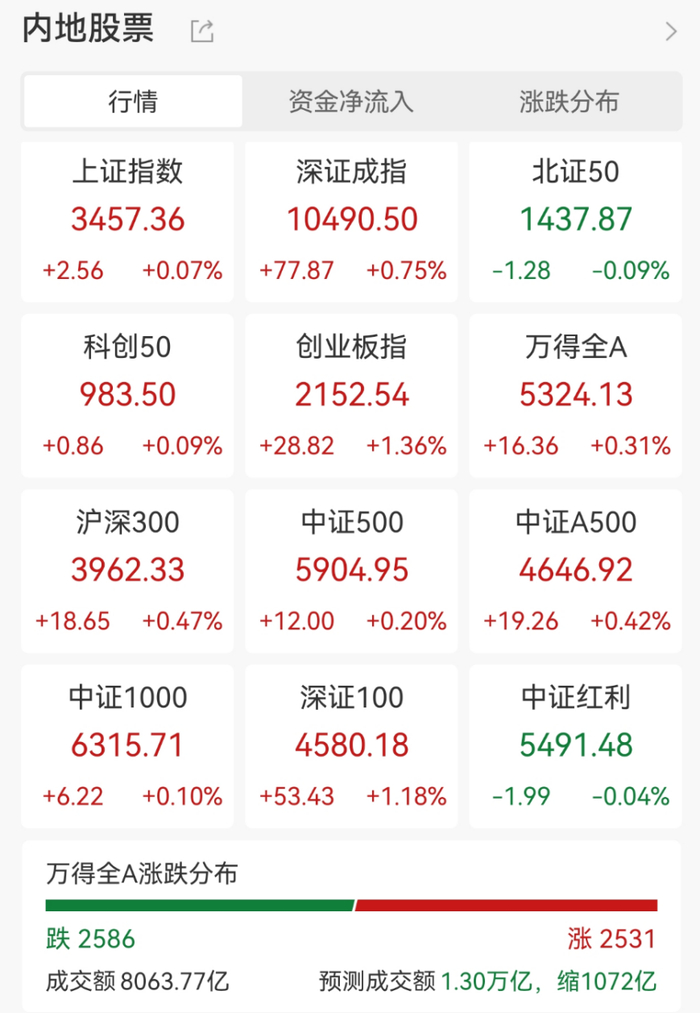 全市场半日成交额为8063.77亿元,较上日小幅缩量;全市场2531只个股上涨,2586只个股下跌。