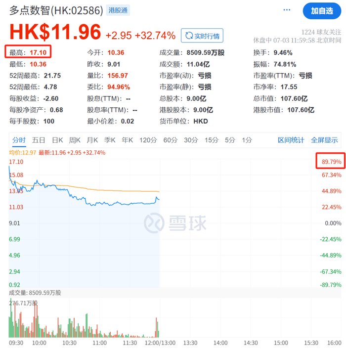 7月3日上午,港股多点数智盘初飙涨,股价最高达到17.1港元/股,涨幅近90%。截至午间收盘,多点数智股价报11.96港元/股,涨幅为32.74%。