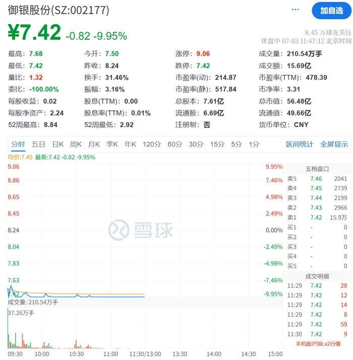 前期因稳定币概念大涨的御银股份,上午持续挣扎在跌停线上。截至午间收盘,报7.42元/股,卖一达15.9万手。