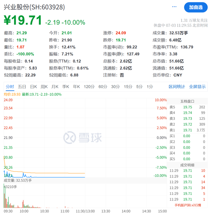 兴业股份开盘走低,随后迅速触及跌停。截至午间收盘,兴业股份报19.71元/股,跌幅为10%,卖一达3.7万手。
