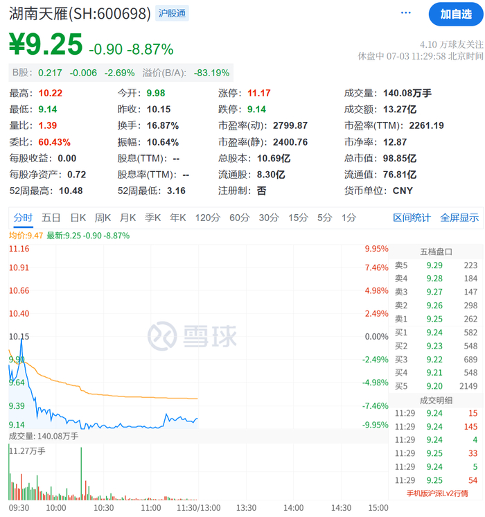 湖南天雁低开低走,盘中反复触及跌停。截至午间收盘,湖南天雁报9.25元/股,跌幅为8.87%。