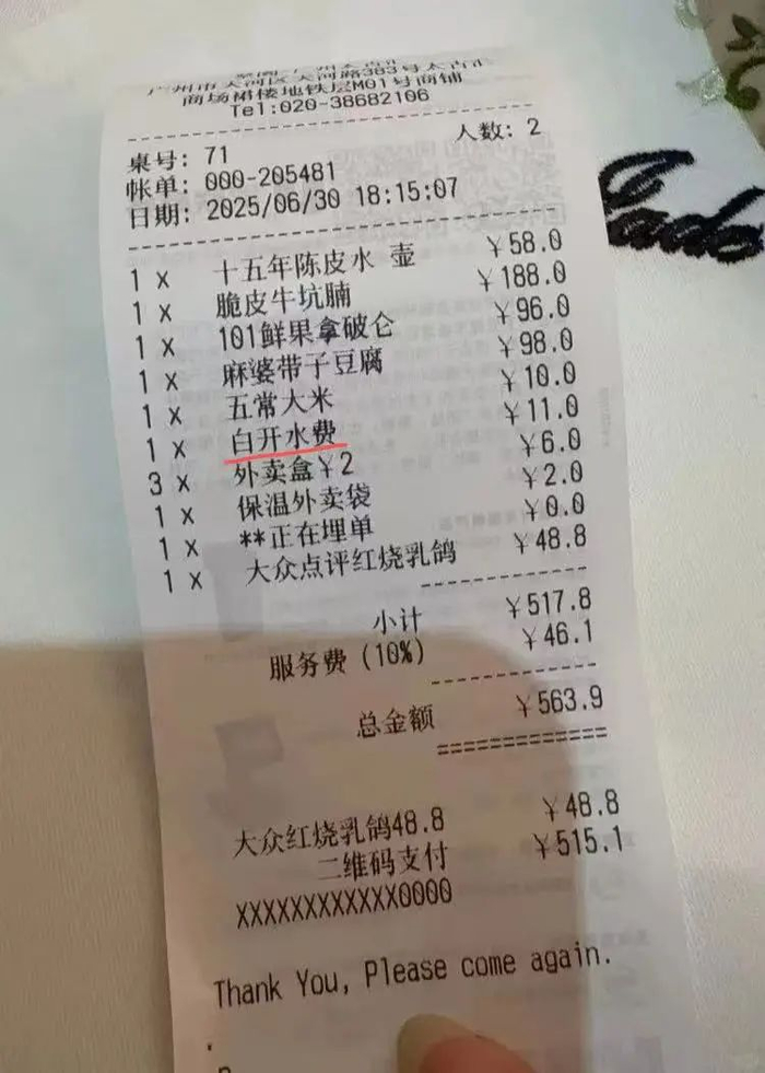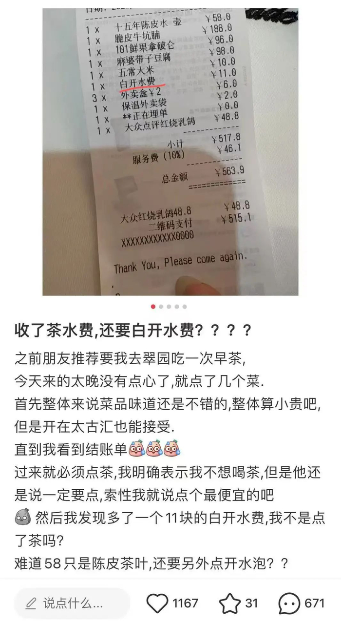 6月30日,网友“Se7en”在广州太古汇翠园用餐时,被服务员告知“必须点茶”,于是选择了一壶最便宜的十五年陈皮水(58元)。然而结账时发现,账单上竟还有一项“白开水费11元”。