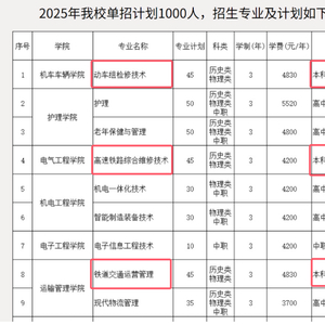 该校2023年单招中,招收本科毕业生的专业和人数与2022年相同。2024年招收本科毕业生的专业增加到两个,分别是动车组检修技术和铁道交通运营管理,各招本科毕业生35人。