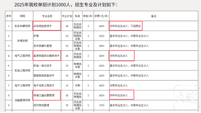 记者注意到,在《郑州铁路职业技术学院2025年单独考试招生章程》中,有三个专业的备注栏注明“本科毕业生”。这三个专业分别是动车组检修技术、高速铁路综合维修技术、铁道交通运营管理。三个专业的招生计划都是45人,其中动车组检修技术专业备注“只招男生”。