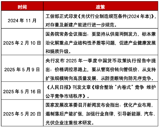 2024年以来光伏主产业链供给全面过剩,主产业链各环节产能达到1000GW以上,供给侧矛盾凸显。自2024年年底开始,我国顶层政策制定机构已多次传递出解决以光伏为代表的重点行业结构性矛盾的决心。(资料参考:国金证券,《光伏中期策略:供给侧困境反转见曙光,看好产能再全球化、技术迭代破局机会》,2025.6.8)