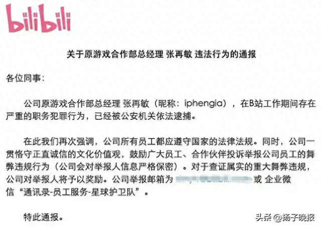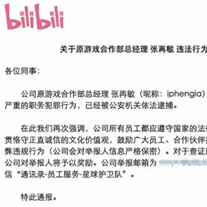 B站通报内部反腐新进展。7月2日,B站在内部邮件中通报,原游戏合作部总经理张再敏在B站工作期间存在严重的职务犯罪行为,已经被公安机关依法逮捕。