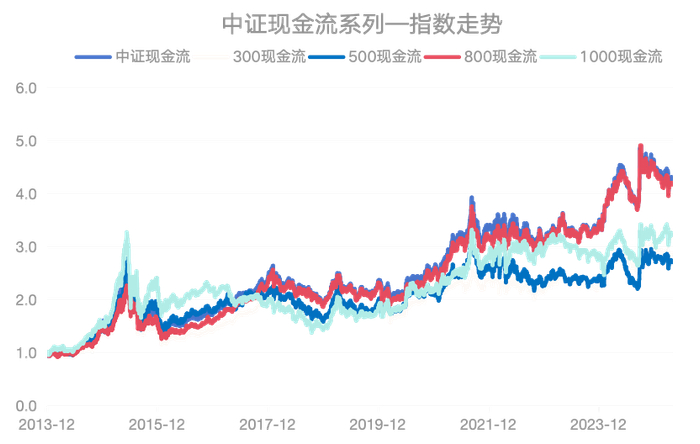 研究表明,对比300现金流、500现金流、800现金流和1000现金流指数,中证现金流在2013年12月31日-2023年12月30日的指数表现,业绩最好的是中证现金流和800现金流指数。