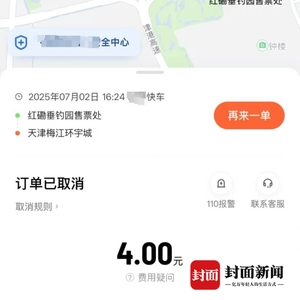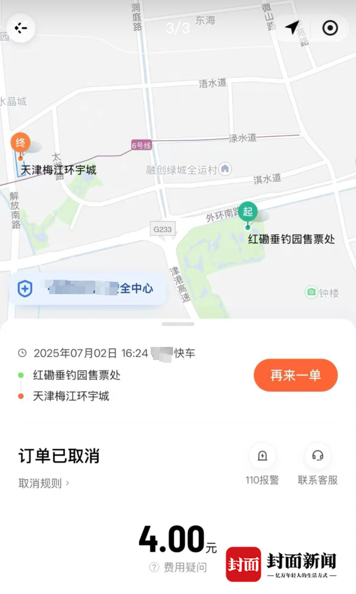 记者从武先生提供的订单信息看到,小石和朋友16:24分通过网约车平台打车同时勾选了第三方平台选项,最终由一位快车司机接单。订单起点为红磡垂钓园售票处,终点是天津梅江环宇城,“两个地方距离不远,路况好的话,车程10分钟左右。但是昨天天津一直下大暴雨,路面的积水没过脚踝了。司机接到孩子后,没有在软件中点击接到乘客,而是开了一小段路,大概2~3分钟,对孩子说下一单要超时了,把他们放路边,要他取消订单重新打车。”