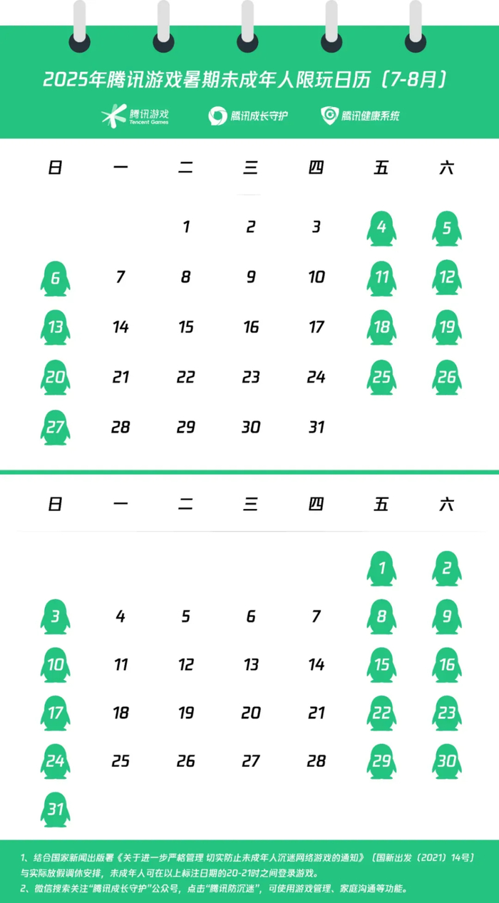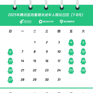 据腾讯公布的“2025年腾讯游戏暑期未成年人限玩日历”显示,7月1日至8月31日之间,每周五、六、日20时至21时之间未成年人可登录游戏,其余时间均为禁玩时段,这也意味着整个暑假可游戏时间总计27小时。