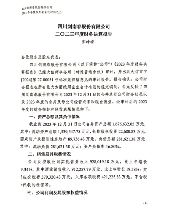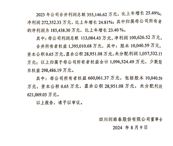 近日,一份未盖公章的四川剑南春股份有限公司(下称“剑南春”)股东大会资料流传于网上。根据这份资料,2024年剑南春的收入过百亿,净利润突破30亿元。