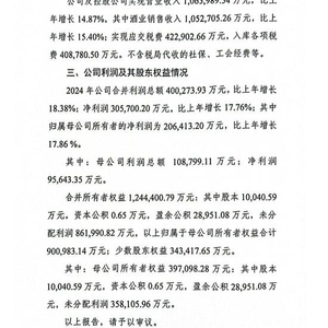 这份资料显示,2024年,剑南春实现营收106.6亿元,同比增长14.9%。其中酒业销售105.3亿元,同比增长15.4%;实现归属母公司股东的净利润20.6亿元,增长17.9%。