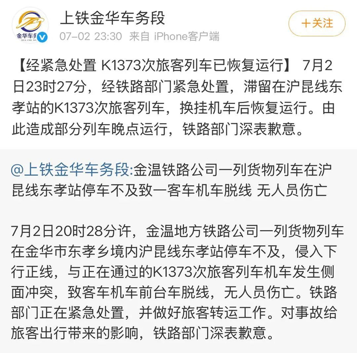 据上铁金华车务段官方微博消息,7月2日20时28分许,金温地方铁路公司一列货物列车在金华市东孝乡境内沪昆线东孝站停车不及,侵入下行正线,与正在通过的K1373次旅客列车机车发生侧面冲突,致客车机车前台车脱线,无人员伤亡。当日23时27分,经铁路部门紧急处置,滞留在沪昆线东孝站的K1373次旅客列车,换挂机车后恢复运行。“由此造成部分列车晚点运行,铁路部门深表歉意。”