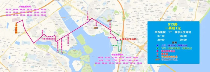 为方便华西医院乘客接驳BRT大学城站,调整390路由园博苑公交场站改至华西医院始发,运营时段由高峰专线变更为常规线路,并同步将线路号变更为913路。