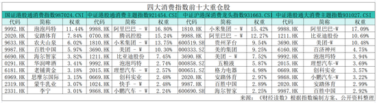 上表为四大消费指数前十大重仓股明细,从上表可以看到,泡泡玛特在国证港股通消费指数中的占比最高,达到11.44%,在另外三只指数中的占比则在4%以下。