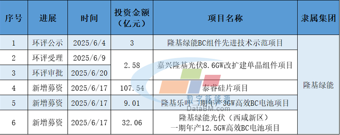 值得关注的是,6月更新项目动态最多的为隆基绿能,共有5个项目完成动态更新。