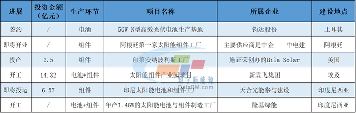 6个海外项目中3个光伏项目披露了其投资金额。其中投资额最大的为新霖飞集团在埃及投资14.32亿元建设的太阳能组件产业园项目。