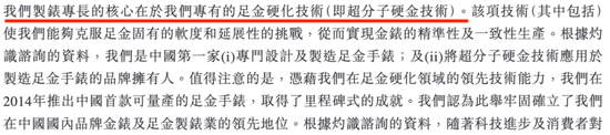 公司制表专长的核心在于足金硬化技术,该项技术克服了足金固有的软度和延展性,从而实现金表的精准性及一致性生产,这使得公司成为中国首个实现足金手表量产的品牌拥有人。