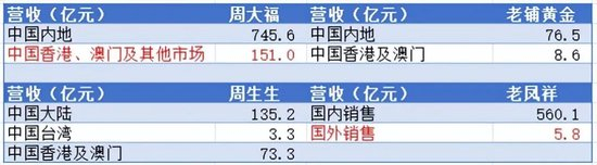 从业务的地区分布来看,珠宝行业的元老级玩家周大福、周生生(00116.HK),还有像老凤祥(600612.SH)、老铺黄金这些代表性企业,业务绝大部分聚焦于国内,难以搅动国外市场。
