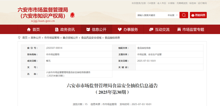安徽省六安市市场监督管理局食品安全抽检信息通告(2025年第30期)