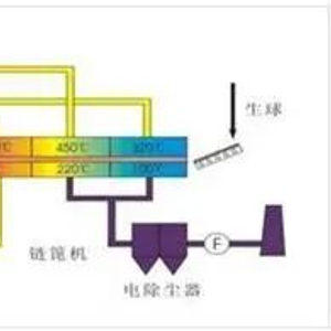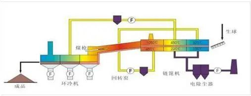 链篦机-回转窑技术主要是指把合格的生球(>6mm,<16mm)布到链篦机上进行干燥、预热后,在回转窑进行氧化固结焙烧,通过环冷机冷却得到球团矿。