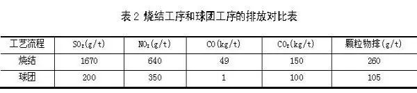 由于球团工艺焙烧供热方式与烧结不同,燃烧后形成的SO2、NOX和CO2排放量相较于烧结工艺少很多。此外,球团矿产生的粉尘量相较于烧结矿减少很多,球团工艺对环境更加友好。烧结工序和球团工序的排放对比见下图: