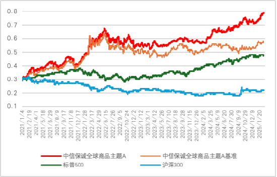 注:基金净值增长率、业绩比较基准收益率来源定期报告,沪深300指数、标普500指数数据来源:Wind,指数表现与单只基金业绩表现不同,不代表基金的业绩表现,且指数运作时间较短,不能反映市场发展的所有阶段。中信保诚全球商品主题基金与标普500指数和沪深300指数涨跌幅不具有可比性,仅供参考。