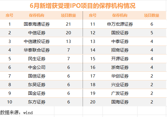 A股市场的竞争同样激烈。Wind数据显示,以上市日为统计口径,截至6月30日,年内共有26家券商助力51单IPO发行上市,中信证券保荐了6单项目,中信建投证券、华泰联合证券分别保荐了5单项目。