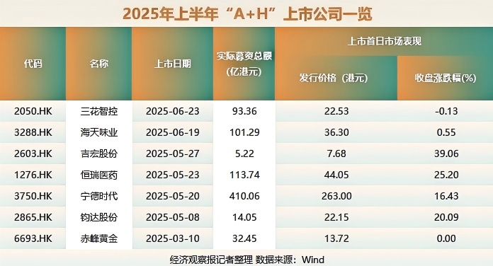 据Wind数据统计,2025年上半年,共有7家“A+H”IPO项目成功上市,募资总额合计为770.17亿港元(合计人民币703.39亿元),占上半年香港IPO融资总额的72.17%。