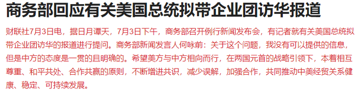 上周末有在传特朗普要率企业团访华,7月3日下午,商务部召开例行新闻发布会,有记者就有关美国总统拟带企业团访华的报道进行提问。商务部新闻发言人何咏前:关于这个问题,我没有可以提供的信息。
