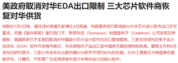中美经贸磋商机制第一次会议所达成的内容开始兑现,美政府取消对华EDA出口限制,三大芯片软件商恢复对华供货。