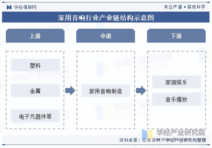 家用音响产业链的上游主要包括原材料供应与核心零部件制造环节。原材料主要包括塑料、金属以及电子元器件,核心零部件主要包括扬声器、芯片、变压器等。家用音响产业链的下游则主要是音响设备的应用终端和销售渠道,家庭音响主要应用于家庭娱乐和音乐播放,因此其应用终端主要是家庭用户。