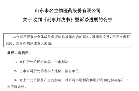 去年2月,未名医药发布公告称,收到山东省淄博市张店区人民法院出具的《刑事判决书》。公告显示潘爱华因职务侵占罪、挪用资金罪被淄博市张店区人民法院一审判处有期徒刑13年。