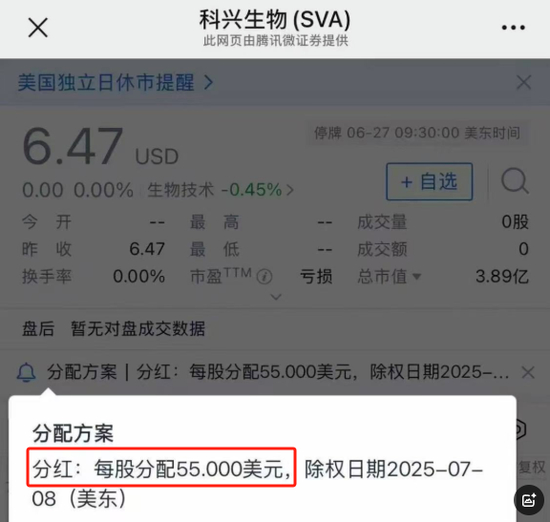 要知道,科兴生物停牌前股价也才为6.47美元/股,市值是3.89亿美元。按第一阶段55美元股息计算,科兴生物的股息率(ttm)将达到850%。换句话说,相当于花100块买股票,直接返现850块。