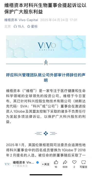 今年4月,维梧资本在官方公众号发文称,其已针对科兴生物董事会在激进投资人1Globe及其盟友控制下采取的诸多不负责任行为发起多项法律诉讼,以保护广大科兴股东的利益。