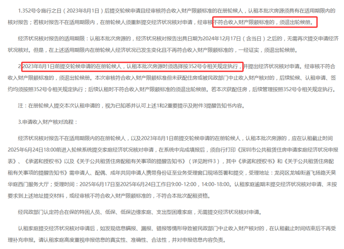 认租公告提及,配租的房源无论2023年8月1日前后入册的轮候家庭,都需审查财产收入标准,认租后提交了经济状况核对申请,但不符合标准的,将做退库处理。