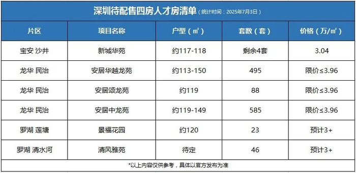 另外,从表里来看,未来除了罗湖有少量四房单位之外,四房人才房的主力军,主要集中在龙华民治的“三龙”,体量或超千套。