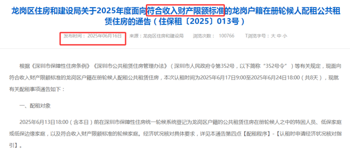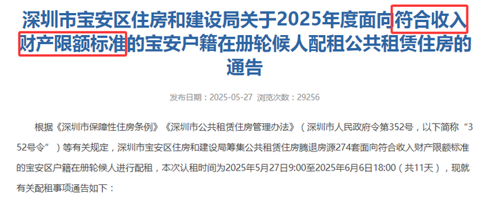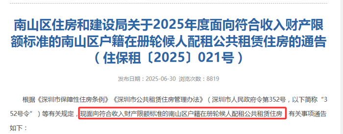 今年,光明、宝安、龙岗、南山4区在发布公租房配租通告时,均提到仅面向符合收入财产限额标准的区户籍在册轮候人中配租。
