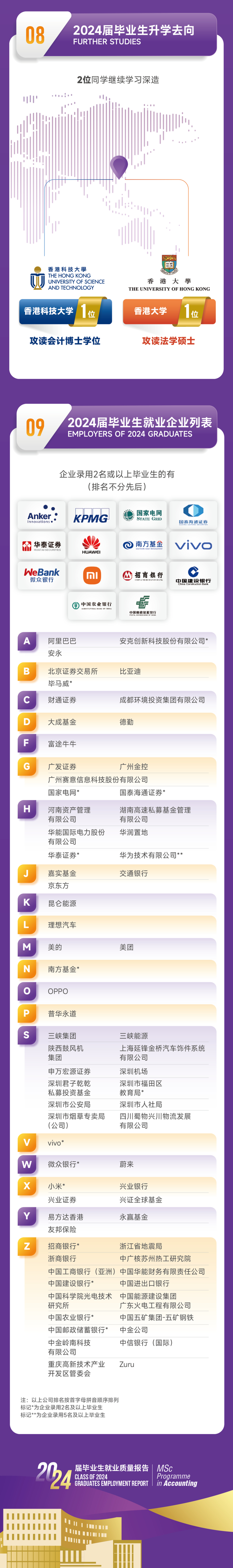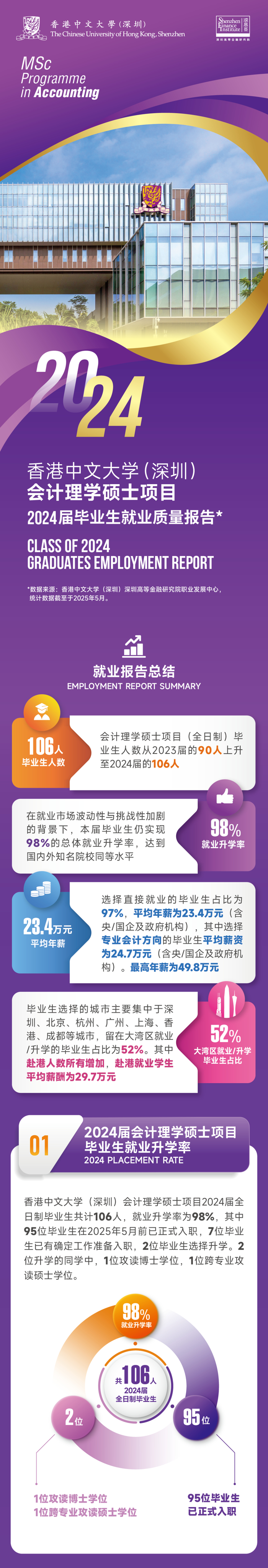 香港中文大学(深圳)会计理学硕士项目于2025年7月发布《2024届毕业生就业质量报告》。在高校毕业生人数持续增长的背景下,2024届会计理学硕士项目全日制毕业生人数较2023届的90人增加至106人(包括2024年3月、7月及10月三批获得学位的毕业生)。面对复杂多变的就业形势,该届毕业生就业率(含升学)仍高达98%,全体毕业生就业去向较为多元,主要包括金融服务、金融科技、科技互联网、银行、央国企及政府机构。