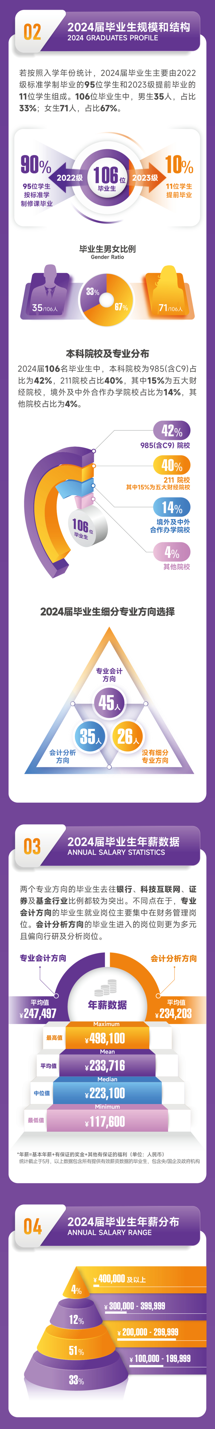 毕业生最高年薪达49.8万元,平均年薪为23.4万元(含央/国企及政府机构),其中选择专业会计方向的毕业生平均薪资为24.7万元(含央/国企及政府机构)。在就业地域选择上,52%的毕业生选择粤港澳大湾区,其中赴港人数有所增加,赴港就业毕业生平均薪酬为29.7万元。