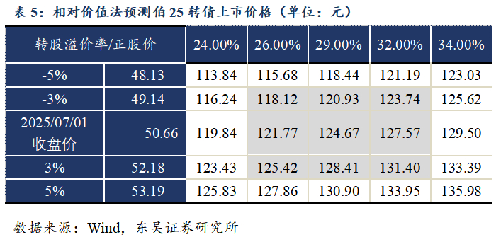 我们预计伯25转债上市首日价格在118.12~131.40元之间。按伯特利2025年7月1日收盘价测算,当前转换平价为96.64元。