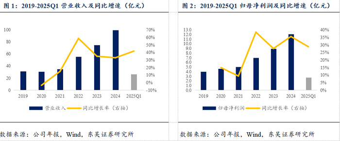 2019年以来公司营收稳步增长,2019-2024年复合增速为25.78%。自2019年以来,公司营业收入总体呈现稳步增长态势,同比增长率“N型”波动。2024年,公司主营业务收入总体呈增长趋势,经营稳定。与此同时,归母净利润也不断增长,2019-2024年复合增速为24.66%。2024年实现归母净利润 12.09 亿元,同比增加35.60%。截至2025年3月31日,2025年Q1,公司的营业收入和归母净利润规模分别达到 26.38 亿元、2.70 亿元。